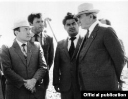 Нурсултан Назарбаев, в бытность председателем Совета министров Казахской ССР (крайний слева), и Динмухамед Кунаев, в бытность первым секретарем ЦК Компартии Казахстана (крайний справа).