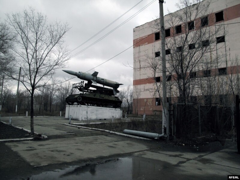 На месте военного городка стоят разрушенные, пустующие дома. Железные балконные ограждения недостроенных домов местное население разобрало на металлолом, а вот металлический памятник с ракетой остался нетронутым. В сумерках города не видно, далеко в степи видны только яркие огни, освещающие территорию зоны.
