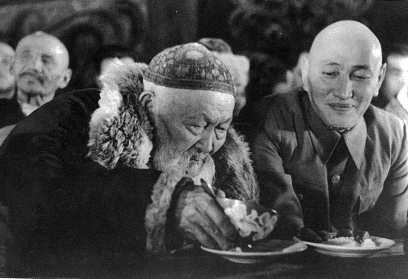 Народный поэт Жамбыл Жабаев и лидер Советского Казахстана Жумабай Шаяхметов на республиканском айтысе акынов в 1943 году. Фото из книги Мадата Аккозина «Вернуть из забвения».