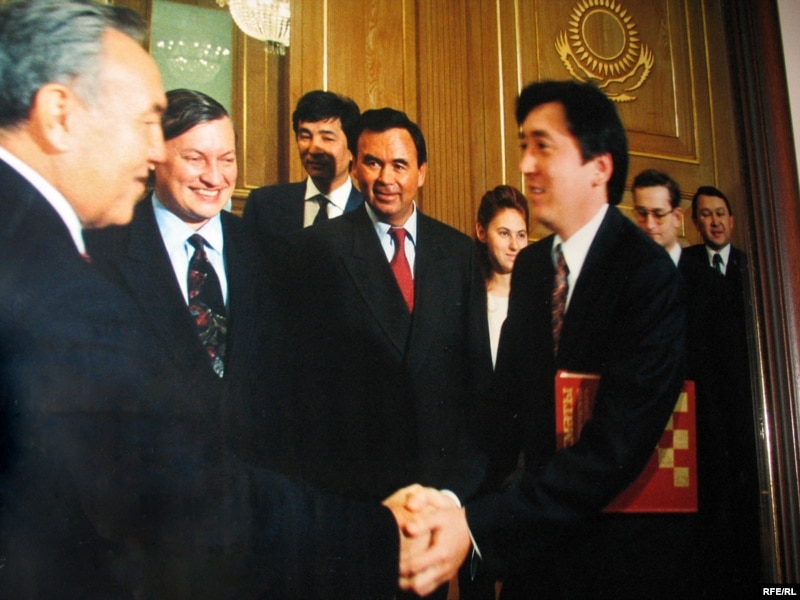 Президент Казахстана Нурсултан Назарбаев поздравляет сына Каришала Асанова - Болата - с участием в международном шахматном турнире, в котором участовал также Анатолий Карпов. Алматы, 2005 год.