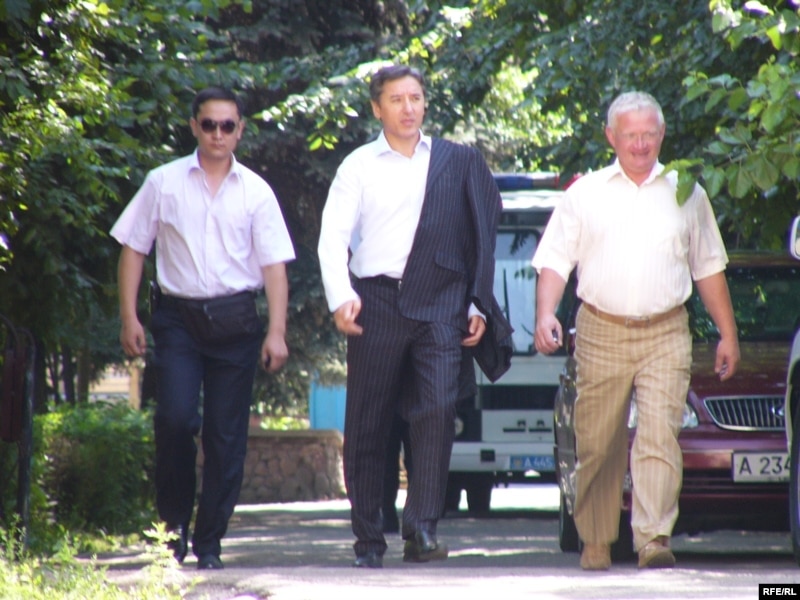 Лидеры партии "Азат" Болат Абилов (в центре) и Петр Своик (справа) идут на акцию протеста в защиту СМИ. Алматы, 24 июня 2009 года.