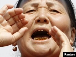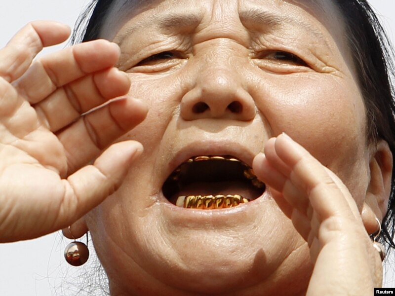 Сторонница Курманбека Бакиева пытается остановить Курултай сторонников Временного правительства. Джалалабад, 14 апреля 2010 года.