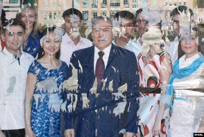 Билборд, где президент Назарбаев изображен со своими молодыми сторонниками. Алматы, 6 июля 2010 года.