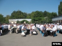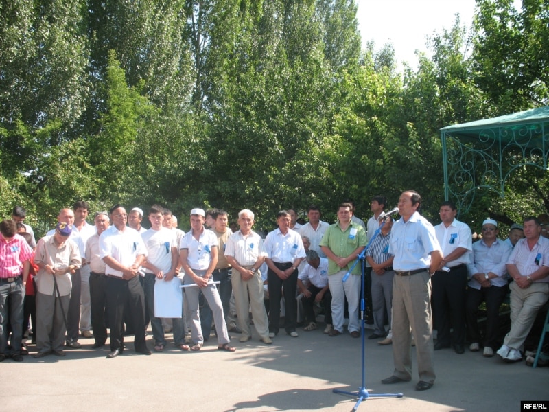 Кахарман Кожамбердиев, заместитель председателя Всемирного конгресса уйгуров, выступает перед участниками поминок. Алматы, 13 августа 2009 года.