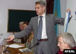 Адвокат Виталий Воронов показывает журналистам схему аварии с участием машины Евгения Жовтиса. Алматы, 4 сентября 2009 года.