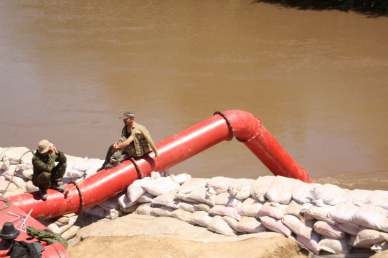 Закачка воды для орошения посевов сои производится мощными насосами из реки Урджар. Урджарский район Восточно-Казахстанской области, 24 мая 2011 года.