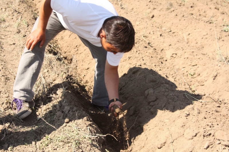 Проблему с решением вопроса Нурлан Биядилов наглядно продемонстрировал корреспондентам нашего радио Азаттык непосредственно в поле, которое на тот момент распахивалось с помощью трактора «К-700». Нурлан Биядилов погрузил руку на глубину 10 сантиметров, достал оттуда образец почвы, сжал ее в кулаке и затем высыпал ее из ладони. По его словам, пригодная по влажности для посева почва должна не рассыпаться, а слипаться в комок.