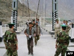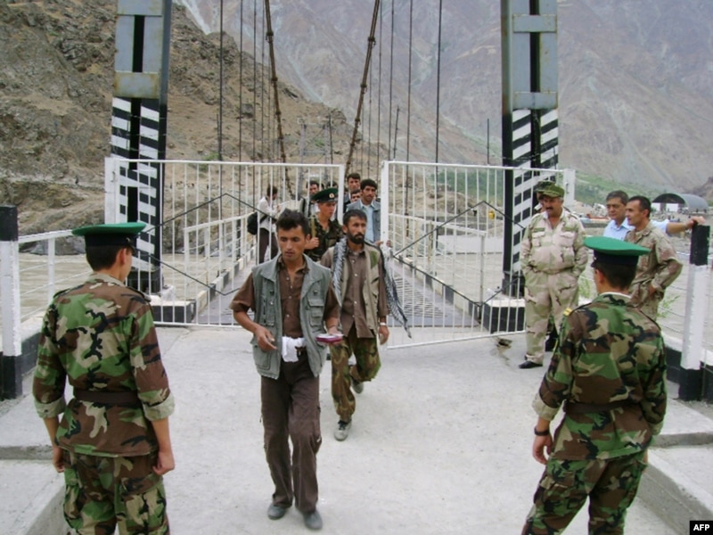Таджикские пограничники проверяют документы людей, переходящих таджикско-афганскую границу. Август 2010 года.