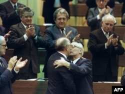 Советский лидер Михаил Горбачев (слева) обнимает коммунистического лидера Восточной Германии Эриха Хонеккера на 11-м съезде Социалистической единой партии Германии. 17 апреля 1986 года.