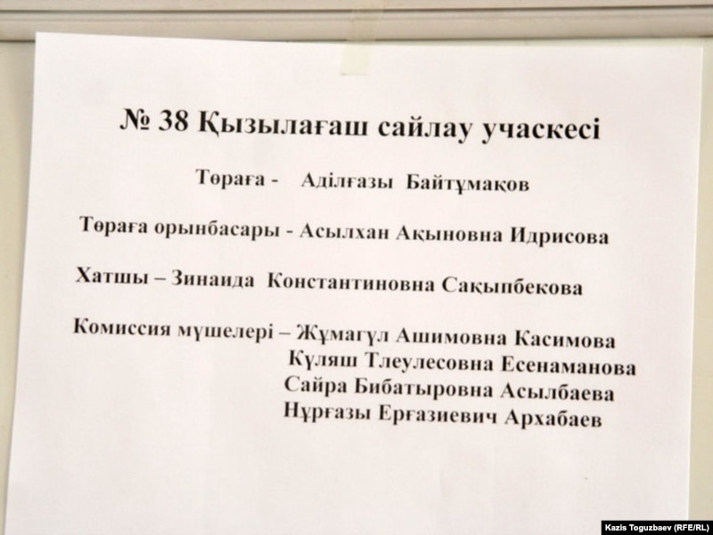 Председатель участковой избирательной комиссии Адилгазы Байтумаков, не без труда припомнивший фамилии некоторых из четырех кандидатов в президенты, сказал, что избирательная комиссия Аксуского района Алматинской области обещала к исходу этого дня прислать эти и другие необходимые атрибуты избирательного участка. Адилгазы Байтумаков, как председатель участковой избирательной комиссии, демонстрировал свою равноудаленность от каждого из кандидатов в президенты. Однако, когда корреспондент радио Азаттык спросил его о том, за кого он будет как обычный гражданин голосовать в день выборов, он без колебания ответил: за Нурсултана Назарбаева.